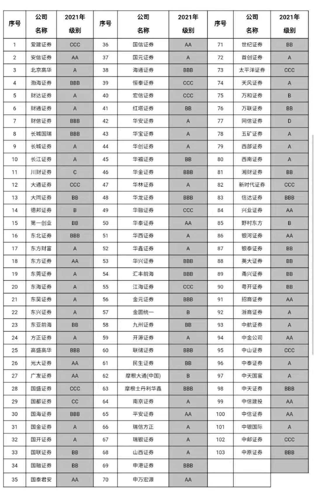 2021年证券公司分类结果如下(按公司名称拼音顺序排序):