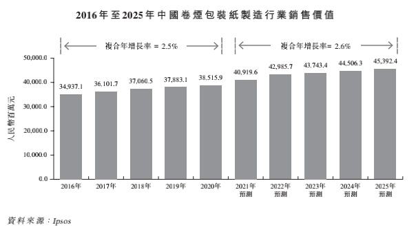 除了规模较小以外,卷烟包装纸制造行业的发展速度也并不出彩。据前述研究机构数据,2016年-2020年中国卷烟包装纸制造行业的销售价值由2016年的约349.37亿元增加至2020年的385.16亿元,复合年增长率仅为2.5%。
