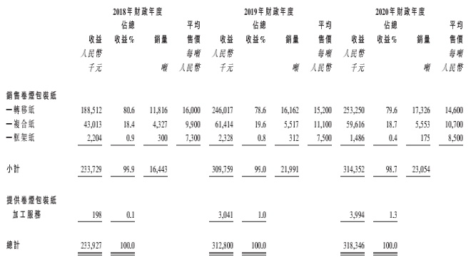 回溯历史经营数据,伟立控股的各项业务的收入占比相对稳定,变化幅度较小。其中,转移纸一直是公司主要收入来源。2018年-2020年,该业务分别贡献收入1.89亿元、2.46亿元、2.53亿元,收入占比分别为80.6%、78.6%、79.6%。