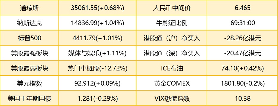 1. 隔夜上周美股收盘,道琼斯指数涨238.2点,涨幅0.68%,报35061.55点;标普500指数涨44.31点,涨幅1.01%,报4411.79点;纳斯达克综合指数涨152.39点,涨幅1.04%,报14836.99点。本周道指上涨1.1%,标普500指数上涨2%,纳指上涨2.8%。港股ADR指数按比例计算,收报27066点,下跌254.88点或0.94%。