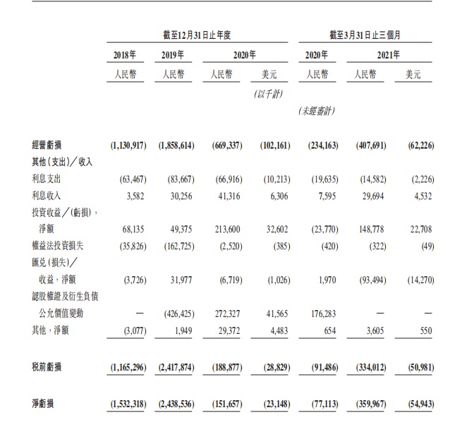 理想汽车于业绩记录期处于亏损状态。于2018年、2019年及2020年以及截至2021年3 月31日止三个月,理想汽车分别产生净亏损人民币15亿元、人民币24亿元、人民币1.52亿元(2314.8万美元)及人民币3.60亿元(5494.3万美元)。