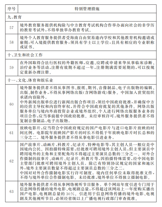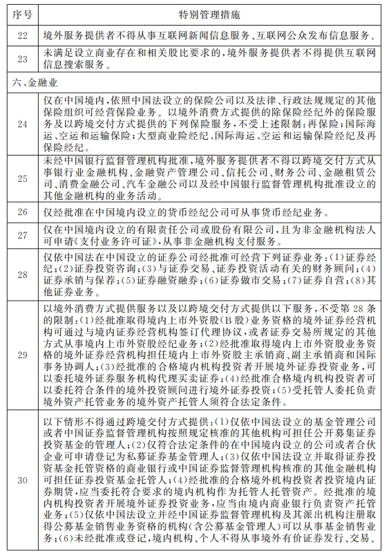 三、境外服务提供者不得以跨境方式提供《海南自由贸易港跨境服务贸易特别管理措施(负面清单)(2021年版)》中禁止的服务;以跨境方式提供《海南自由贸易港跨境服务贸易特别管理措施(负面清单)(2021年版)》之内的非禁止性领域服务,按相应规定管理。