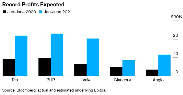 据分析师估计,全球五家大型矿商力拓(RIO.US)、必和必拓(BHP.US)、嘉能可、Anglo American Plc 及淡水河谷(VALE.US)今年上半年的利润总计或将达到850亿美元,较上年同期增长逾一倍。其中力拓、淡水河谷及Anglo American Plc将在本周公布财务业绩,第一家公布业绩的力拓预计将本周三宣布2021年上半年利润220亿美元,与2020年全年利润持平。