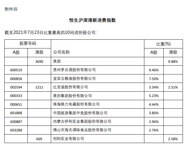 截至2021年7月23日,该指数比重最高的10间成分股分别为美团(03690)、贵州茅台(600519.SH),宜宾五粮液(000858.SZ)、比亚迪(002594.SZ/01211)、美的集团(000333.SZ)、格力电器(000651.SZ)、中国中免(601888.SH)、伊利集团(600887.SH)、海天味业(603288.SH)、创科实业(00669),占比分别为9.88%、9.46%、7.5%、3.34%(A)/2.51%(H)、5.23%、4.44%、3.86%、2.96%、2.76%、2.58%。