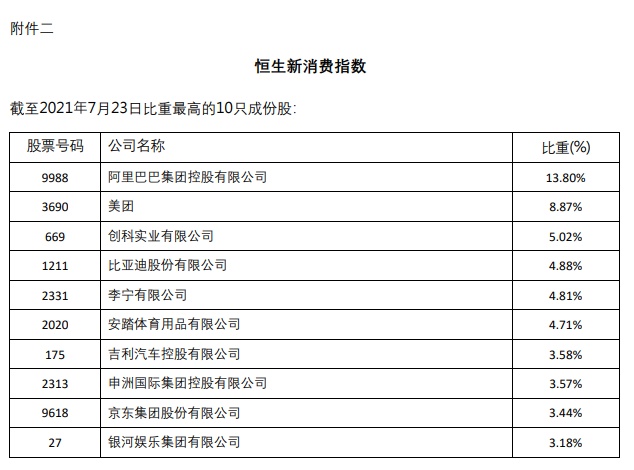 另外,截至2021年7月23日,该指数比重最高的10只成分股分别为阿里巴巴(09988)、美团(03690)、创科实业(00669)、比亚迪(01211)、李宁(02331)、安踏(02020)、吉利汽车(00175)、申洲国际(02313)、京东(09618)、银河娱乐(00027),占比分别为13.8%、8.87%、5.02%、4.88%、4.81%、4.71%、3.58%、3.57%、3.44%、3.18%。