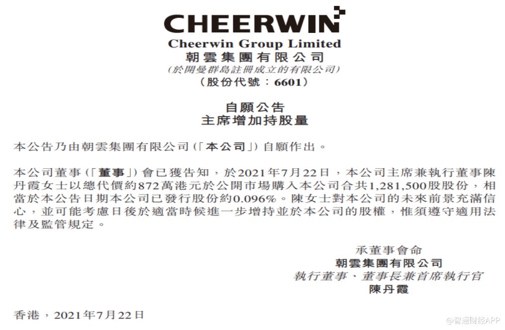 智通财经APP获悉,朝云集团(06601)于7月22日发布公告,公司董事会已获告知,于2021年7月22日,公司主席兼执行董事陈丹霞以总代价约872万港元于公开市场购入公司合计128.15万股股份,相当于公告日期公司已发行股份约0.096%。