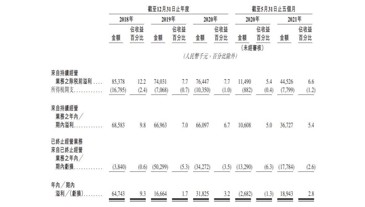 于2018 年、2019年、2020年及截至2020年及2021年5月31日止五个月,华瑭医疗的持续经营业务收益分别为人民币6.98亿元、人民币9.56亿元、人民币9.91亿元、人民币 2.12亿元及人民币6.74亿元,华瑭医疗的持续经营业务溢利分别为人民币6858.3万元、人民币6696.3万元、人民币6609.7万元、人民币1060.8万元及人民币3672.7万元。