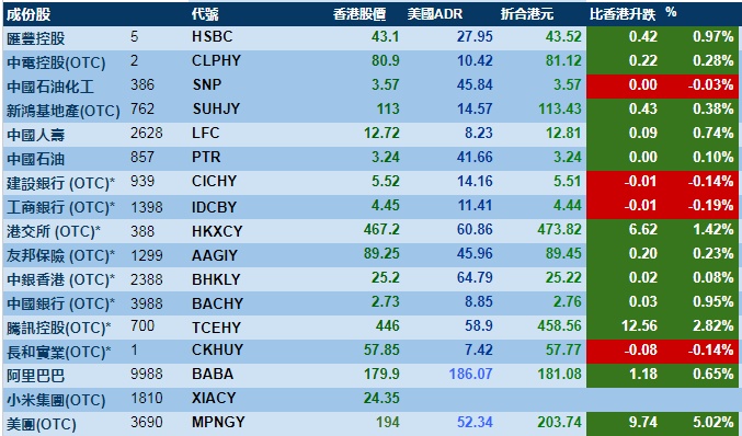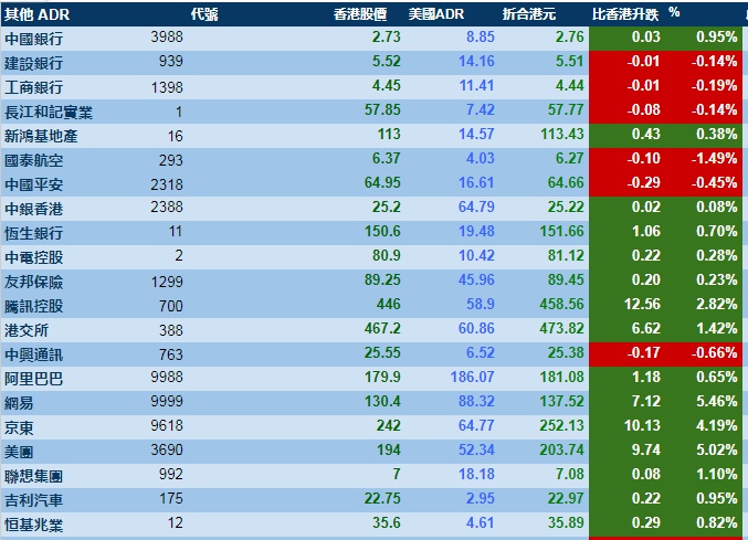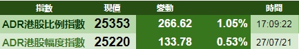 智通财经APP获悉,周二美股三大指数齐跌,港股ADR指数上涨,按比例计算,收报25353点,上涨266.62点或1.05%。