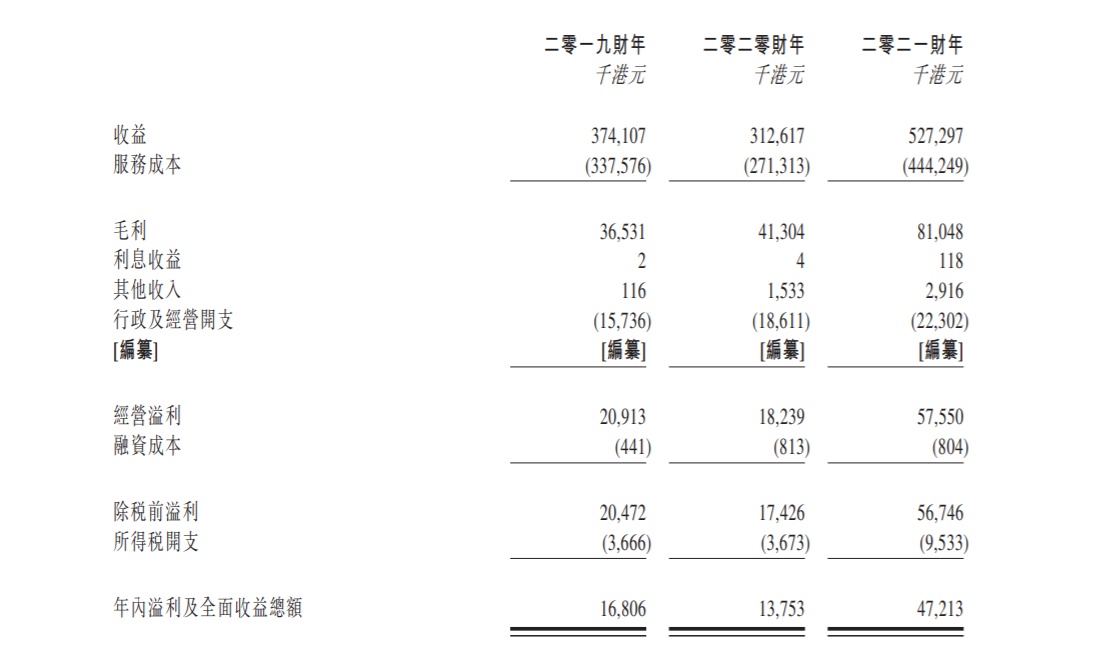 于2019财年、2020财年及2021财年,新世纪储运的总收益分别约为3.74亿港元、3.13亿港元及5.27亿港元,同期净利润分别为1680.6万港元、1375.3万港元及4721.3万港元。