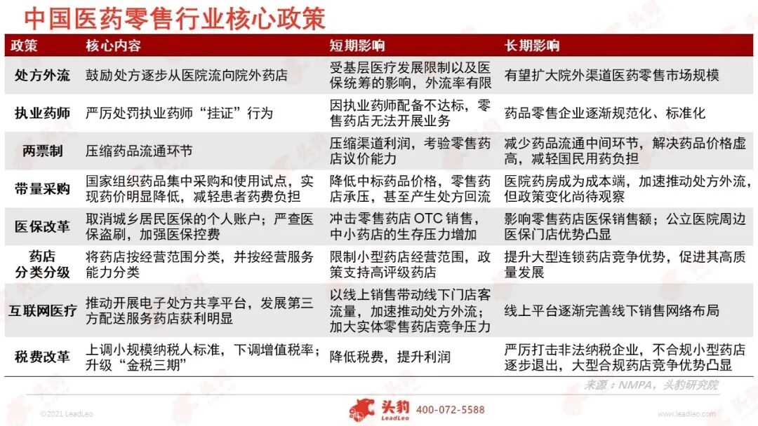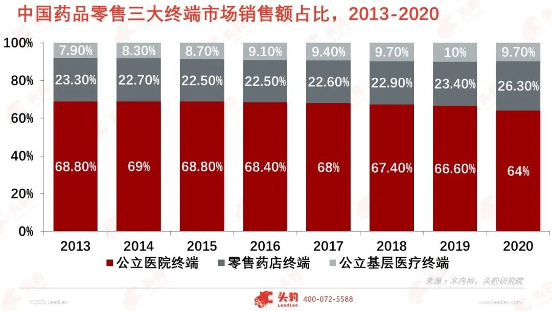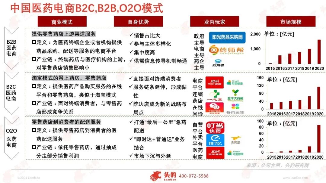 2020年中国药品三大零售终端(公立医院、零售药店和公立基层医疗)销售额16,437亿元,同比负增长8.5%,其中公立医院终端10,512亿元,零售药店终端4,330亿元,公立医疗基层终端1,595亿元。 受疫情、集采和重点监控目录影响,公立医院终端近年来首次出现负增长,而零售药店终端在三大终端受疫情影响最小,恢复较快。 近年来,健康需求升级、处方外流等助力医药零售市场扩容,消费习惯变化,地域限制突破等推动药品终端流量再分配。 新冠疫情催化下,“互联网+医疗健康”加速发展,赋予消费者更多的选择权与更大的决策权,推动传统零售高毛利时代加速落幕,迎来医药新零售时代。 屏幕端消费崛起,零售药店终端占比有望提升 中国医药市场的药品终端可分为三大终端六大市场,即公立医院终端(城市公立医院和县级公立医院)、零售药店终端(实体药店和网上药店)和公立基层医疗终端(城市社区卫生中心和乡镇卫生院)。 零售药店终端占比自2015年逐渐扩大。米内网数据显示,2020年三大药品零售终端的销售额为16,437亿元,公立医院虽仍然以64.0%占据绝对份额,但五年来零售药店和基层医疗机构的占比正逐渐增大,其中零售药店的终端占比从2013年的23.3%增长至2020年的26.3%。2020年上半年受新冠疫情影响,医院端需求萎缩,药店端需求进一步提升。 医药B2B、B2C、O2O各迎新机,药企互联网公司纷纷布局 2020年中国医药电商市场规模达1,956亿元,增长28.3%,占中国医药市场总规模的11.4%。医药电商商业模式逐渐完善,B2B、B2C、O2O三种商业模式相互补充。 医药B2B利好行业上下游:疫情使得医药流通传统线下模式面临供应不足、信息迟缓、交通受限等多重考验,B2B平台作为链接上游供应链和下游终端的“桥梁作用”开始彰显; 疫情下医药电商B2C逆势爆发:医药B2C模式成为主流购药方式,具有药品种类丰富性、线上诊疗开药一体化便捷性、下沉地区药品可及性等优势,更好地满足社会需求,创造更大社会价值; 疫情催热医药O2O,药店药企入局增量:随着线上支付体系的逐渐完善,疫情催化线下无接触配送模式的渗透率大幅提升,医药O2O迎来加速发展期。传统连锁药房扩大O2O业务布局,单体药店通过O2O拓展服务半径,互联网药品配送平台陆续启动投融资计划。 利好政策频出,医药零售发展势头正盛 政策推动是催生行业业态发生变化的主因。近年来,为提高医药零售行业集中度,规范业内发展,促进处方外流,政府部门围绕执业药师、处方外流、带量采购和药店分级分类管理等方面发布一系列核心政策。 其中,两票制、带量采购、医保改革等政策持续落地,提高行业门槛,提升行业集中度;药店分级分类管理制度的实施、电子处方流转平台的设立、互联网在线诊疗及开方政策的逐步完善、执业药师配套等政策的不断细化,均从各维度支持处方外流的发展趋势。 疫情刺激在线医疗快速发展,千亿市场规模可期 2020年中国在线医疗市场规模196亿元,预计到2025年将增长至1,058亿元。新冠肺炎疫情期间,线上诊疗平台表现突出,加深广大民众对在线医疗的认识,提高在线问诊的民众认可度,促进线上诊疗领域的建设。 互联网医疗,是互联网在医疗行业的新应用,包括以互联网为载体和技术手段的健康教育、医疗信息查询、电子健康档案、疾病风险评估、在线疾病咨询、电子处方、远程会诊及远程治疗和康复等多种形式的健康医疗服务。 抢占处方外流先机,DTP成各药品零售企业“必争之地” DTP(Direct to Patient),指药品生产企业绕开商业代理、政府药品招标采购环节,将产品直接授权给药店作为代理,患者在医院获得处方后可以从药店直接购买药品,并获得用药指导与服务的模式。 为抓住处方外流的市场机会,各大零售药店企业积极布局开设DTP专业药房。至2020年底,益丰拥有40多家DTP药房,大参林89家,老百姓143家,国药一致超过100家。 2018-2020年,益丰药房DTP经营品种从近200个增长至近400个,老百姓DTP经营品种从343个增长至635个,扩充速度快。区别于以出售OTC药品为主的传统零售药店,DTP药房主要销售高毛利专业药物、新特药、自费药等,并配备执业药师提供专业指导意见及服务,是零售药店的进阶模式。 深度见解:各大企业抢滩处方外流,构建医药零售新格局 政策加持,处方外流走上快车道:处方外流指医院对外开放处方单,患者可凭借处方单在零售药店购买处方药。为推动处方外流,2006年卫生部提出“医院不得以任何方式限制处方外流推进医药分开”。 多年来处方外流相关政策不断,政策出台集中在明确禁止限制处方外流、对零售药店的规范及鼓励电子处方三大方向。2020年中国公立医院药品市场规模为10,512亿元,预计未来公立医院药品市场以2%的增速增长,处方外流有望给医药零售市场带来千亿市场增长空间。 互联网巨头、医药企业、传统零售药店的医药新零售动作频繁:京东健康公司是中国最大的在线医药零售平台,全国设有11个药品仓库,渠道网络覆盖全国超过200个城市,销售规模扩张迅速; 华润三九通过与阿里健康、平安好医生等大型互联网+医疗健康公司业务合作,探索构建“互联网+医+药”的线上化产业链模式; 益丰大药房设立海南益丰互联网医院有限公司、海南益丰远程医疗中心有限公司,打造线上+线下、全科+专科的家庭医生及居家药师全渠道、全方位的服务体系。 疫情让互联网医疗迎来爆发的契