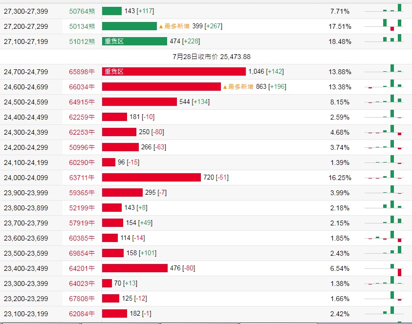 牛证街货重货区在24,700-24,799区间,该区间最新牛证数量为1046张,较上一交易日增加142张;最多新增在24,600-24,699区间,该区间最新牛证数量为863张,较上一交易日增加196张。