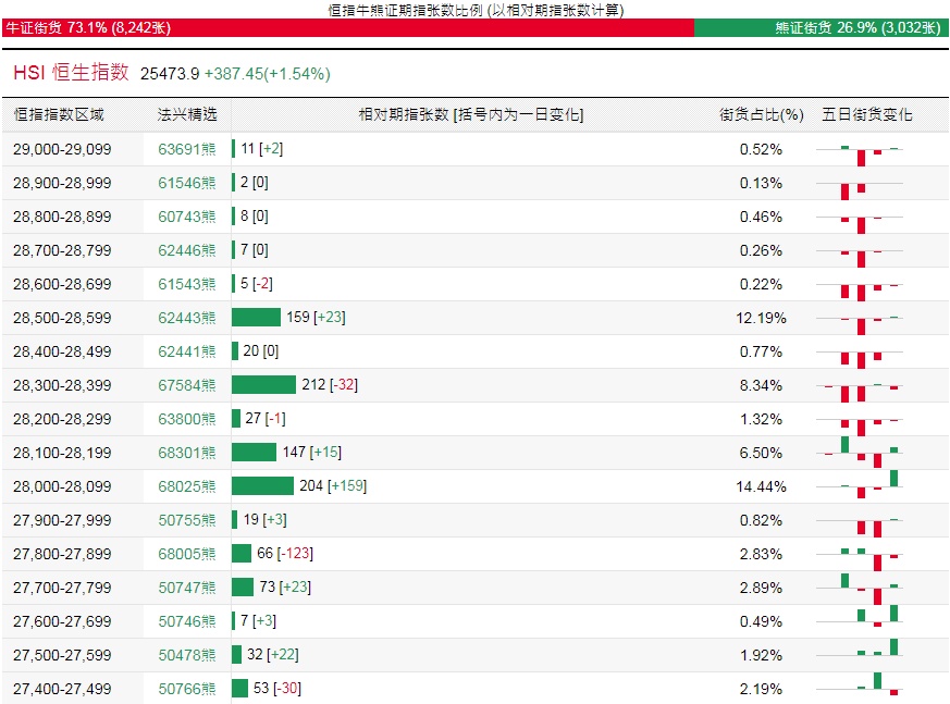 法兴恒指牛熊证街货分布图中的数据显示,熊证街货重货区在27,100-27,199区间,该区间最新熊证数量为474张,较上一交易日增加228张;最多新增在27,200-27,299区间,该区间最新熊证数量为399张,较上一交易日增加267张。
