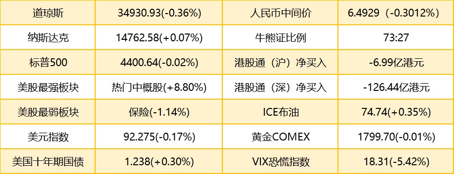 1. 隔夜美股截至收盘,道琼斯指数跌127.59点,跌幅0.36%,报34930.93点;标普500指数跌0.82点,跌幅0.02%,报4400.64点;纳斯达克综合指数涨102.01点,涨幅0.7%,报14762.58点。港股ADR指数上涨,按比例计算,收报26187点,上涨713.65点或2.73%。