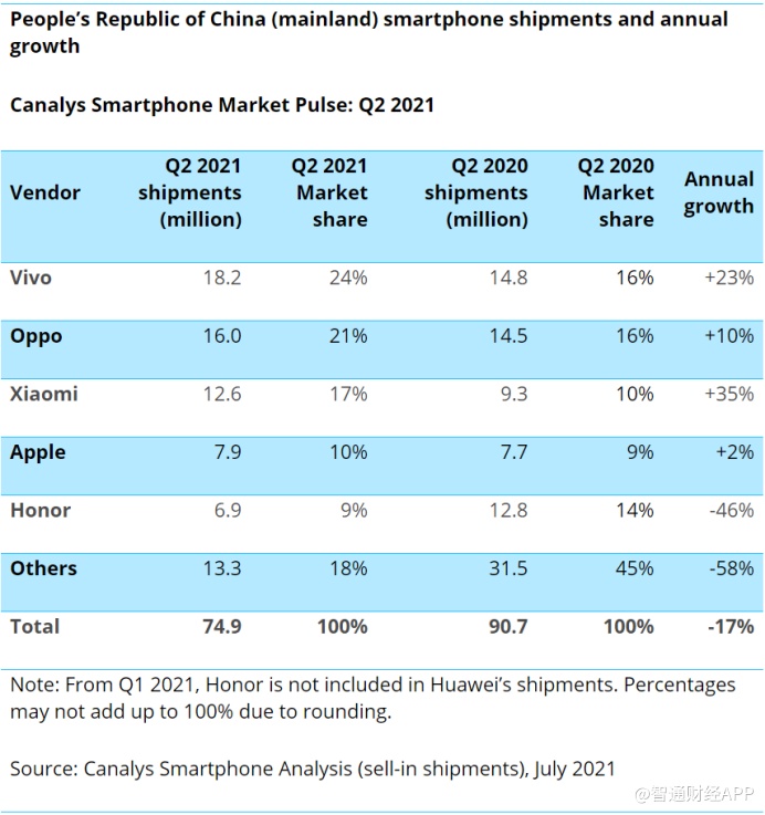 智通财经APP获悉,7月29日,Canalys发布报告称,2021年二季度,中国大陆智能手机市场出货量达到7490万台,同比下降17%。