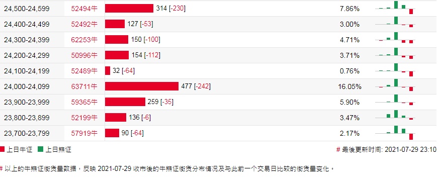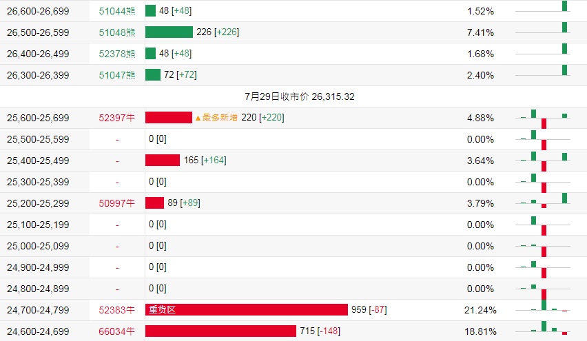 牛证街货重货区在24,700-24,799区间,该区间最新牛证数量为959张,较上一交易日减少87张;最多新增在25,600-25,699区间,该区间最新牛证数量为220张,较上一交易日增加220张。