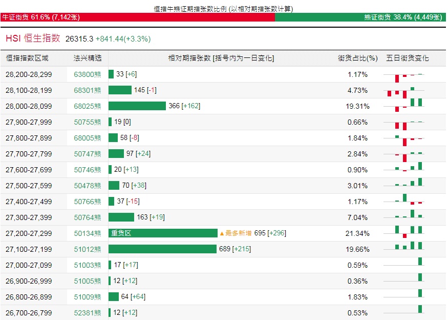 法兴恒指牛熊证街货分布图中的数据显示,熊证街货重货区在27,200-27,299区间,该区间最新熊证数量为695张,较上一交易日增加296张;最多新增在相同区间。