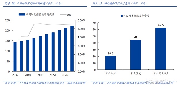 慢性淋巴细胞白血病(CLL)是成人中最常见的一种白血病,在2017年,全球约有114000例新发的CLL病例。根据国家癌症中心公布的数据,目前我国淋巴瘤预计发病率约为 6.89/10 万;据世界卫生组织统计,淋巴瘤全球发病率年增长率为 7.5%,是目前发病率增长最快的恶性肿瘤之一,全球每年约有 35 万新发病例。国盛证券认为中国淋巴瘤市场将在五年内突破 200 亿元。