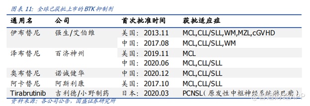 其中百济神州的泽布替尼在中国和美国两地获批上市,并且两地上市时间间隔不到一年,用时远小于强生/艾伯维的伊布替尼,也证明百济神州强大的研发实力。