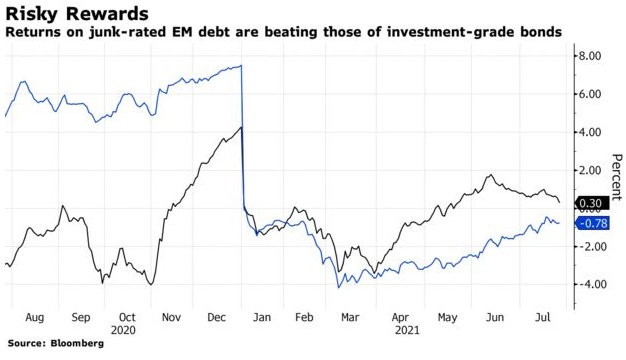 各国央行的经济刺激措施促使投资者寻求更高的收益率。尽管新冠疫情卷土重来,但新兴市场还没有对新冠变种病毒风险完全定价,债券相比股票更有投资价值,加上投资者担心美国利率上升导致贷款成本更高,新兴市场的垃圾级债券(也称“高收益债券”)的收益率在今年大幅超过了更安全的发展中国家债券。