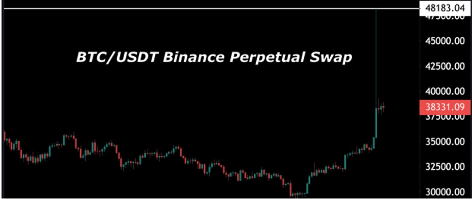 币安平台上,比特币期货和现货价格之间的价差达到了8000美元。BTC/Tether永久期货合约从上周日的3.8万美元飙升至4.8万美元。