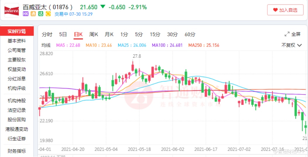 看上去,百威亚太销售表现一派欣欣向荣景象,但公司股价在二级市场的表现难尽人意,最近一周跌幅超过10%。