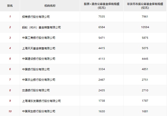 智通财经APP获悉,7月30日,中基协发布2021年二季度基金代销机构公募基金保有规模前100强名单。招商银行股份有限公司以7535亿元规模位列股票+混合公募基金保有规模占据第一。蚂蚁(杭州)基金销售有限公司、工商银行、天天基金销售有限公司、建设银行、中国银行、农业银行、交通银行、浦发银行、民生银行则位列股混基金保有规模前十。非货币市场公募基金保有规模则是蚂蚁(杭州)基金销售有限公司以10594亿元占据首位,这是基金代销机构非货币基金保有规模首次突破一万亿元。