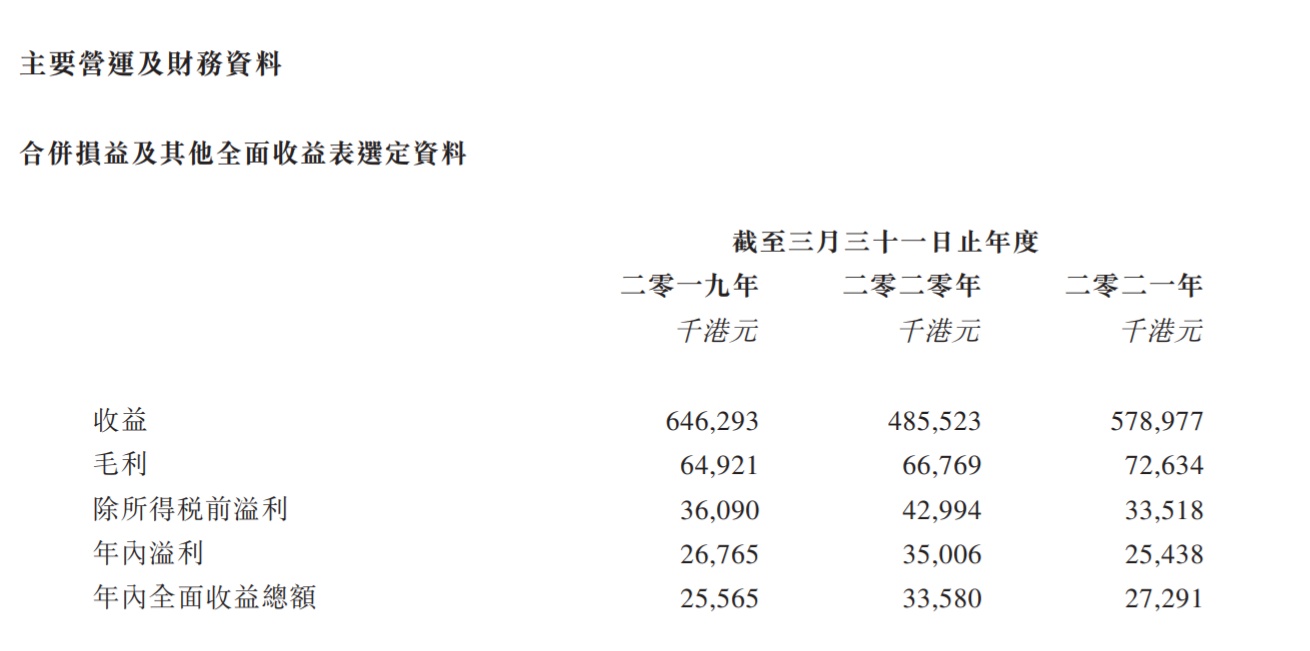 于2019财年、2020财年及2021财年,卓越物流的总收益分别约为6.46亿港元、4.86亿港元及5.79亿港元,同期净利润分别为2556.5万港元、3358万港元及2729.1万港元。