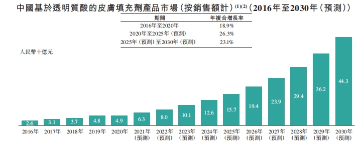进一步细分,爱美客主要产品所处的基于透明质酸的皮肤填充剂产品市场规模由2016年的24亿元增加至2020年的49亿元,复合年增长率约为18.9%;而到2025年,该市场规模或将达到157亿元,对应复合年增长率为26.3%;预计到2030年,上述市场的规模则将达到443亿元,对应复合年增长为23.1%。