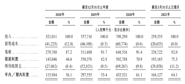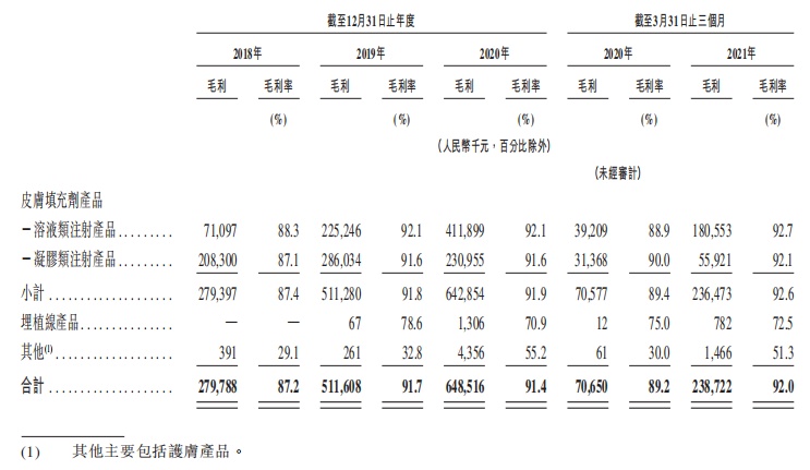 盈利方面看,2018年-2020年爱美客的毛利分别为2.8亿元、5.12亿元、6.49亿元,对应毛利率为87.2%、91.7%、91.4%。今年第一季度末,公司的毛利率继续上升,达到了92%。