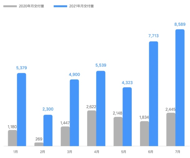 智通财经APP获悉,8月1日,理想汽车(LI.US)公布2021年7月交付数据。理想汽车7月交付8,589辆理想ONE,单月交付量首次超过八千辆,同比2020年7月增长251.3%,环比2021年6月增长11.4%。2021年前七个月,理想汽车总交付量达38,743辆。理想ONE目前累计交付量已达72,340辆。