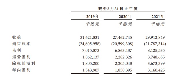 截至2019年、2020年和2021年3月31日,年内溢利分别为15.4亿元、18.5亿元及31.6亿元。
