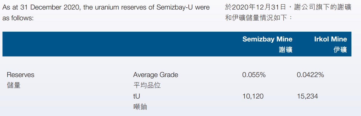 据悉,谢公司旗下有两座矿山,分别是谢米兹拜伊铀矿(简称“谢矿”)与伊尔科利铀矿(简称“伊矿”)。截至2020年12月31日,谢矿的储量为1.01万吨铀,平均品位0.055%;“伊矿”的储量为1.52万吨铀,平均品位0.0422%。按照持股的权益,中广核矿业每年可从“谢公司”获得588吨铀的包销量。