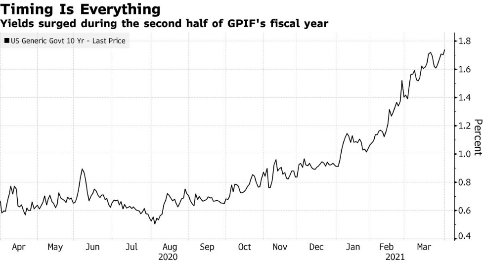 不过,市场不可能全面评估GPIF调整的时机选择是否恰当,因为该基金不披露调整是在12个月期间何时所发生的。在此期间,债券市场出现了巨大波动,10年期美国国债收益率在该基金本财年的上半年基本上是横向波动,但在下半年飙升了约100个基点,至1.7%左右。