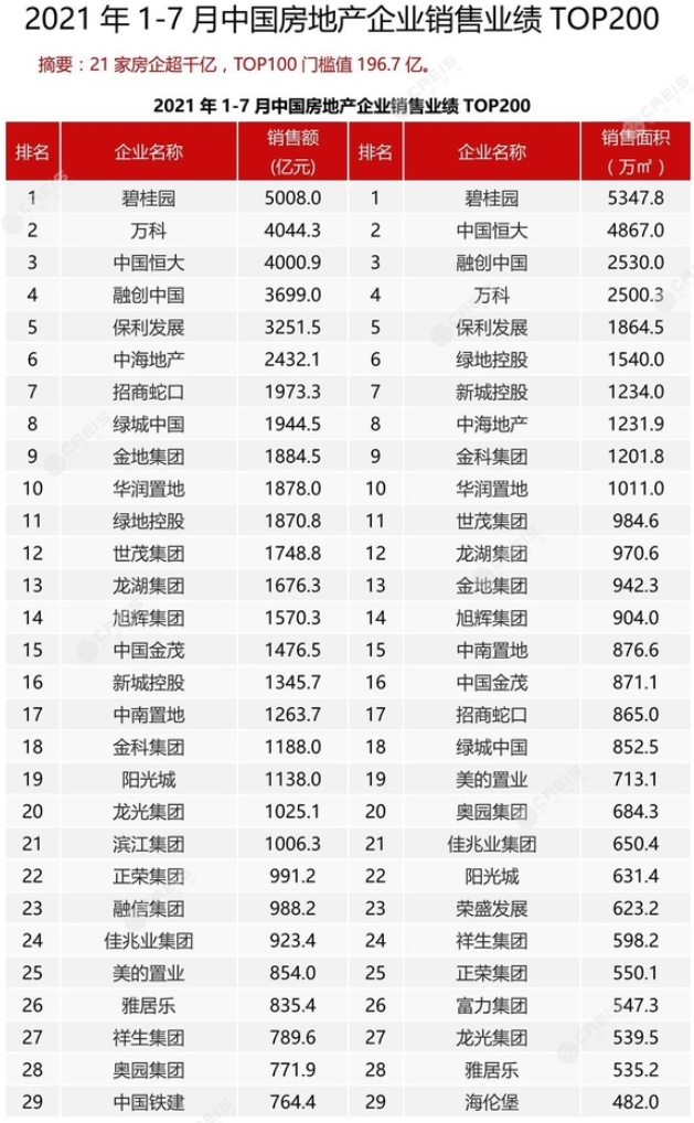 1、21家房企超千亿,TOP100房企销售额均值为794.7亿元