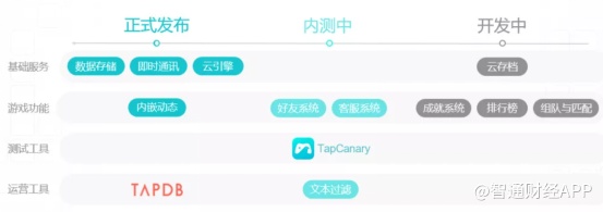 未来TDS 将推出“游戏功能”、“测试工具”、“运营工具”与“基础服务”等四大模块的功能。目前,TDS 已经发布了内嵌动态、TapDB、数据存储、即时通讯、云引擎等服务;好友系统、客服系统、游戏测试工具「TapCanary」、全球化的文本过滤等服务正在内测中;云存档、成就系统、排行榜、组队与匹配等服务,也已进入开发状态。