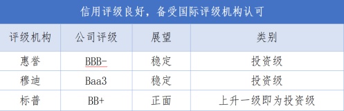 基于稳健的财务状况、可持续增长的前景以及资本市场信用良好,碧桂园获得穆迪和惠誉等权威评级机构的认可。其中,穆迪将碧桂园评级逆势调升至投资级Baa3,标普也于2020年将公司评级展望由“稳定”调升至“正面”。穆迪报告指出,碧桂园的Baa3发行人评级反映了该公司强大的品牌实力、多元的地域布局、强劲的流动性和穿越周期的具有弹性且稳健的运营记录。
