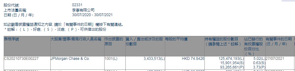 智通财经APP获悉,香港联交所最新资料显示,7月27日,小摩增持李宁(02331)343.3513万股,每股作价74.8426港元,总金额约为2.57亿港元。增持后最新持股数目约为1.25亿股,最新持股比例为5.02%。