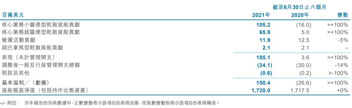 2021年上半年,太平洋航运录得基本溢利1.504亿美元,为13年来最佳的半年度业绩,主要受益于干散货运租金持续强劲增长。公司的核心业务录得的小灵便型及超灵便型干散货船按期租合约对等基准的日均收入分别为14,380美元及18,260美元。