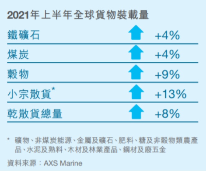太平洋航运指出,强劲的运价主要受到干散货商品需求回升的推动,1H21全球干散货运输量同比增长8%;按货物分类,铁矿石、煤炭、粮食和小宗散货的运输量分别同比增长4%、4%、9%和13%。
