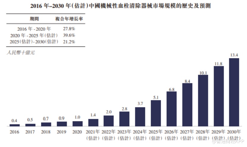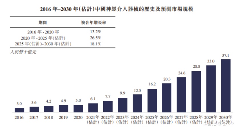庞大的未满足治疗需求以及日渐增长的手术量成为带动该市场规模增长的重要原因。招股书显示,2020年,国内神经介入医疗器械市场规模达到50亿元,2016-2020年复合增长率达到13.2%,预计该市场规模将会以26.5%的复合增长率在2025年增至162亿元,并在2030年进一步达到371亿元,复合增长率达到18.1%。