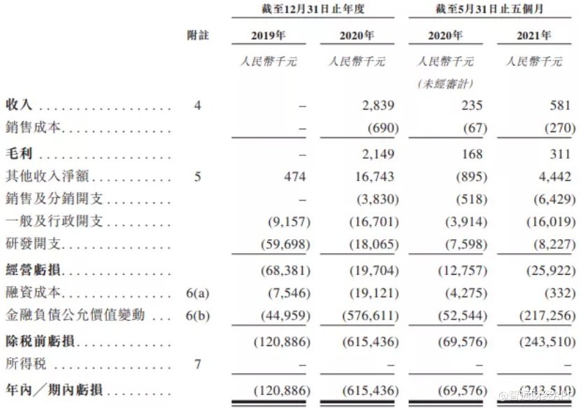 招股书显示,在过去的2019年、2020年和2021年前五个月,禾木生物的营业收入分别为 0、283.9万和58.1万元人民币,相应的净亏损分别为 1.21亿、6.15亿和 2.44亿元。