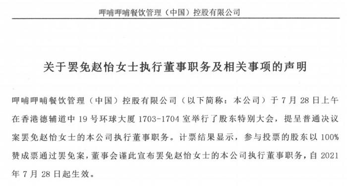 声明还称,7月28日上午举行的上市公司股东特别大会,参与投票的股东以100%赞成票通过罢免案,董事会谨此宣布罢免赵怡女士的本公司执行董事职务,董事会认为,赵怡继续参与管理不符合公司及所有股东的整体最佳利益。