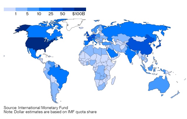 国际货币基金组织成员国将获得6500亿美元的特别提款权,不同颜色代表不同额度的特别提款权分配