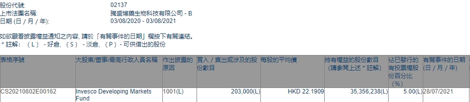 Fund增持腾盛博药-B(02137)20.3万股,每股作价22.1909港元,总金额约为450.48万港元。增持后最新持股数目约为3535.62万股,最新持股比例为5%。