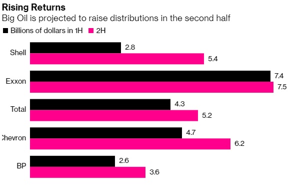 仍背负沉重债务负担的埃克森美孚是上周唯一一家没有宣布更大规模回购的石油巨头。 雪佛龙恢复了回购,荷兰皇家壳牌公司(RDS.A.US)出人意料地提高股息。 道达尔(TTE.US)将把在每桶油价超过60美元时产生的额外现金流中分配40%用于回购。