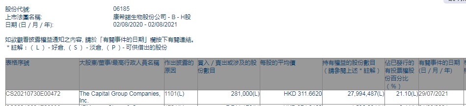 智通财经APP获悉,香港联交所最新资料显示,7月29日,美国资本集团增持康希诺生物-B(06185)28.1万股,每股作价311.662港元,总金额约为8757.7万港元。增持后最新持股数目约为2799.45万股,最新持股比例为21.1%。