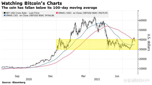 比特币也跌至100日移动均线下方,在其50日移动均线支撑位达到约34773美元之前,比特币可能会进一步走软。