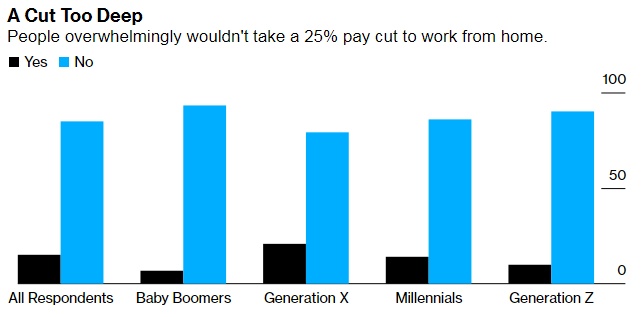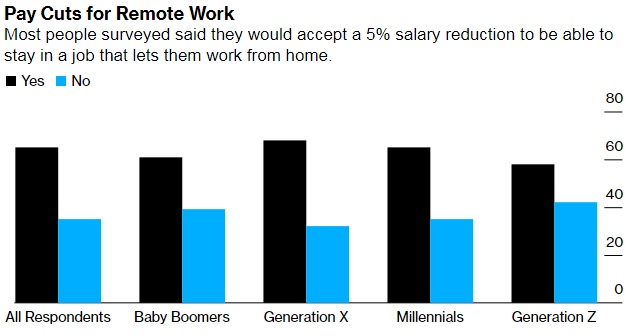 由保险公司Breeze委托进行的一项在线调查发现,65%的美国员工表示,他们的工作完全可以远程完成,他们愿意接受5%的减薪以寻求居家办公。这可能是一种合理的经济权衡,取决于通勤成本。去年的一项研究估计,美国居民在家工作每个月可以节省数百美元的通勤费用。