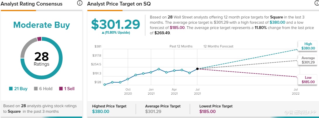 基于21次买入、6次持有和1次卖出,Square的共识评级为“适度买入”,平均目标价为301.29美元,较当前水平上涨约12%。