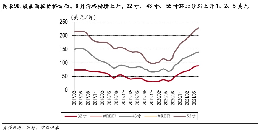 据智通财经APP了解,受疫情影响,海外市场电视、笔记本、平板设备等需求十分旺盛,这使得液晶面板供不应求,价格出现上涨——截至6月,55英寸及以下中小尺寸面板采购价同比涨幅都在90%以上,其中55英寸、43英寸、32英寸面板同比上涨97.3%、98.6%和151.4%。